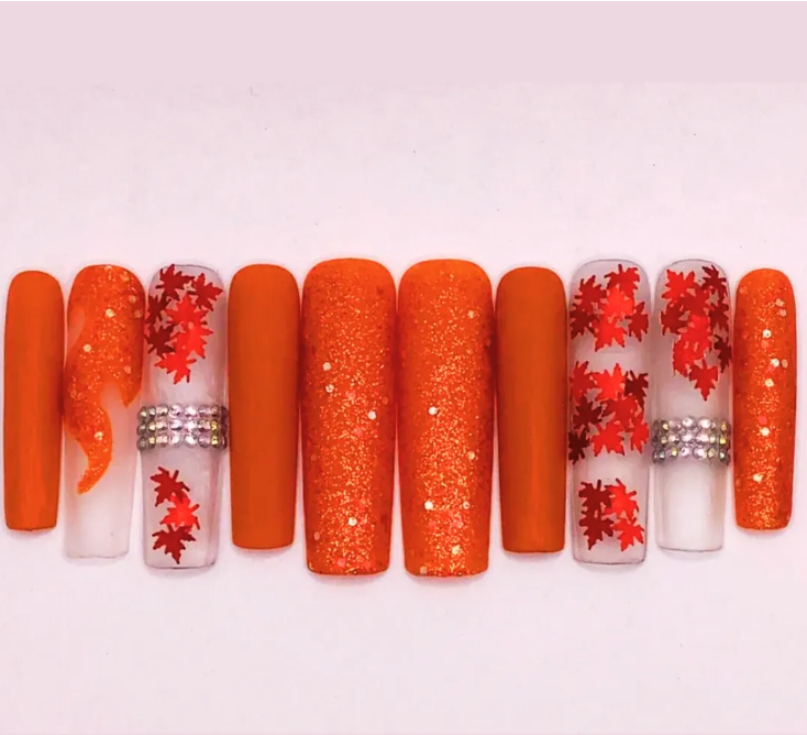 Capture the essence of fall with the Autumn Ember Press-On Nails! This cozy and fiery set features a stunning mix of matte and glittery burnt orange tones, accented with delicate red maple leaves and sparkling rhinestone bands. The combination of warm autumn hues and elegant clear accents makes this set perfect for the season, whether you're sipping pumpkin spice lattes or embracing crisp fall vibes.