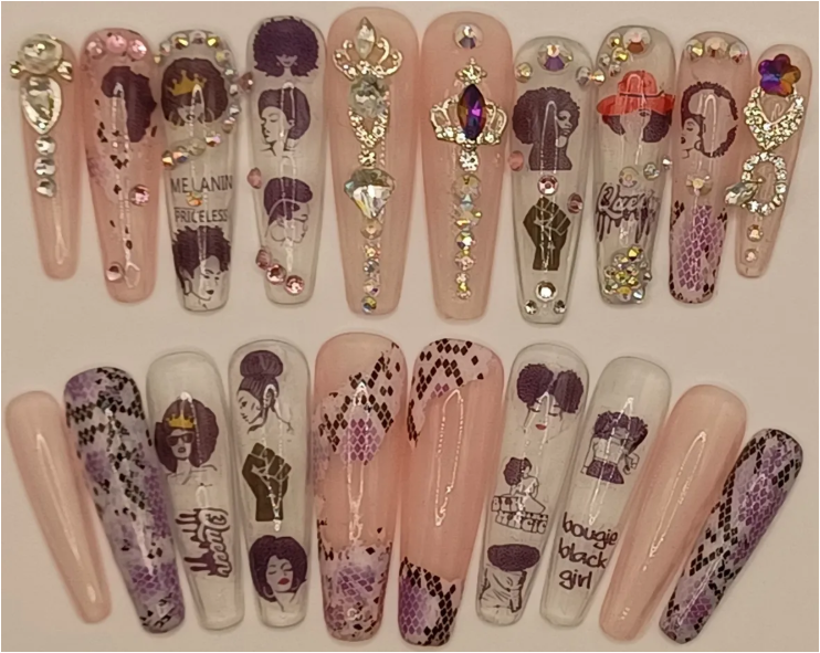 Melanin Monarch is a 20-piece handmade X-long coffin press-on nail set that honors the legacy, power, and beauty of Black women. Featuring soft nude and white tones layered with intricate Afrocentric art, raised fists, crowns, and elegant silhouettes, this set speaks volumes without saying a word. Embellished with regal rhinestones, purple jewel accents, and detailed cultural patterns, each nail is a tribute to pride, heritage, and resilience. Crafted with premium gel polish and encapsulated for a salon-quality, long-lasting finish. Available in S,M,L,and PF (Precision Fit) with our nail sizing service. Choose from pre-designed sets or customize a unique design just for you. Each set comes with a complete nail prep and application kit to ensure a flawless application and prevent damage during removal. Wear them with purpose—because royalty runs deep.