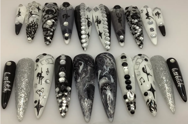 Command attention with Center Stage, a handmade 3X-long stiletto press-on nail set that celebrates the spirit of dance and the art of performance. This 20-piece set stuns in a monochrome palette of black, white, and silver, featuring musical notes, dancer silhouettes, and dramatic embellishments. Glitter, rhinestones, and marble accents amplify the energy, while each stiletto shape adds sharp elegance and movement. Crafted with premium gel polish and encapsulated for a salon-quality, long-lasting finish. Perfect for performers, creatives, or anyone who lives to shine under the lights. Available in S,M,L,and PF (Precision Fit) with our nail sizing service. Choose from pre-designed sets or customize a unique design just for you. Each set comes with a complete nail prep and application kit to ensure a flawless application and prevent damage during removal.