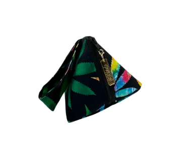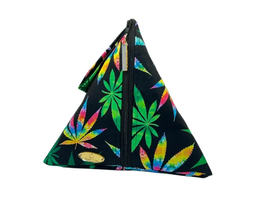 The Cosmic Leaf Duo makes a bold and colorful statement. Featuring a striking black base adorned with vibrant rainbow and green cannabis leaf patterns, this set blends edgy personality with functional design. Both pyramid-shaped bags come with sturdy zippers and wristlet straps, making them perfect for organizing essentials while showing off your unique style.