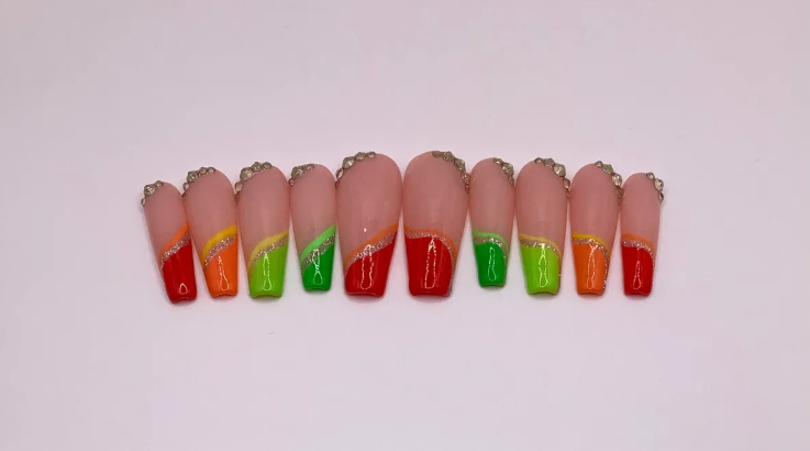 Turn up the heat with these Long Coffin Press-On Nails, featuring a bold red, orange, and green French tip design with a high-gloss finish and small silver rhinestones. The vibrant gradient mimics the colors of a tropical sunset, adding an eye-catching and stylish touch to your look. Handcrafted with premium gel polish and encapsulated for a durable, salon-quality finish, this 10-pack set is available in S,M,L, and PF (precision fit) with our nail sizing service to ensures a flawless, customizable fit. Perfect for those who love bold, tropical-inspired nails with a touch of elegance! Choose from pre-designed sets or customize a unique design just for you. Each set comes with a complete nail prep application kit, application and nail care instructions to ensure a flawless application and prevent damage during removal.