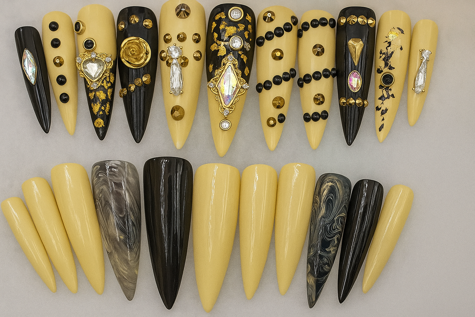 Gold Reign is a 20-piece handmade X-long stiletto press-on nail set that exudes power, luxury, and high-drama style. Featuring a bold contrast of matte beige and glossy black, this set is elevated with gold embellishments, rhinestones, metallic foil, and marbled accents. Each nail is a statement—whether it's jeweled in royal gems or swirling with smoky detail. Made with premium gel polish for a salon-quality, long-lasting finish. Available in S,M,L,and PF (Precision Fit) with our nail sizing service. Choose from pre-designed sets or customize a unique design just for you. Each set comes with a complete nail prep and application kit to ensure a flawless application and prevent damage during removal. Perfect for those who wear confidence like a crown—because royalty never blends in.