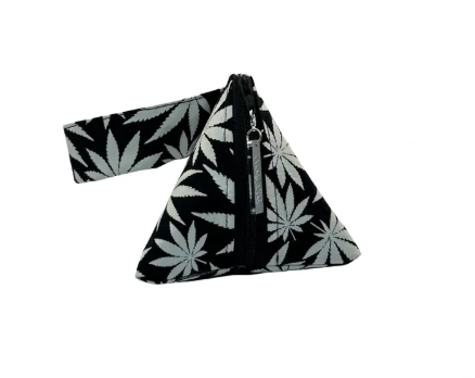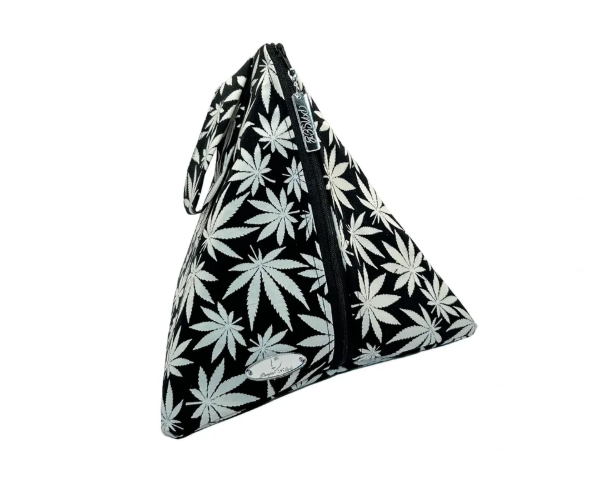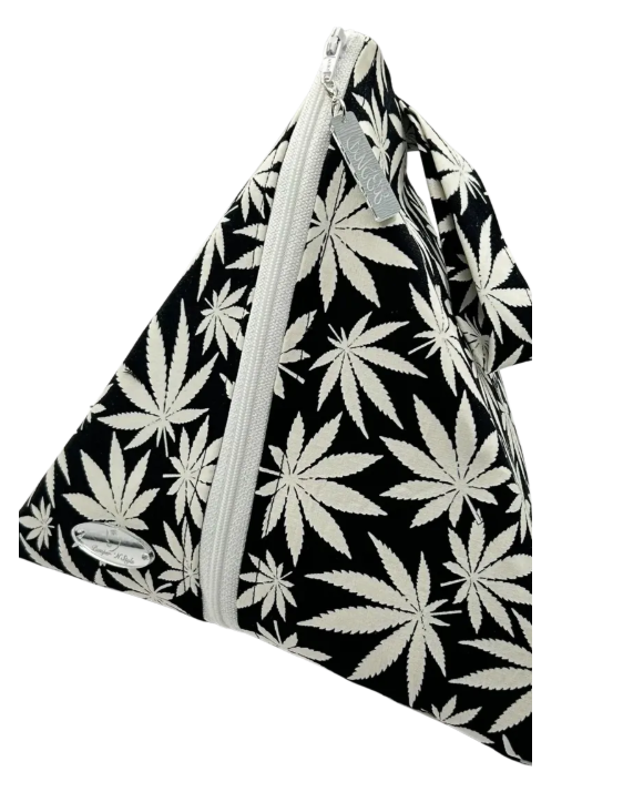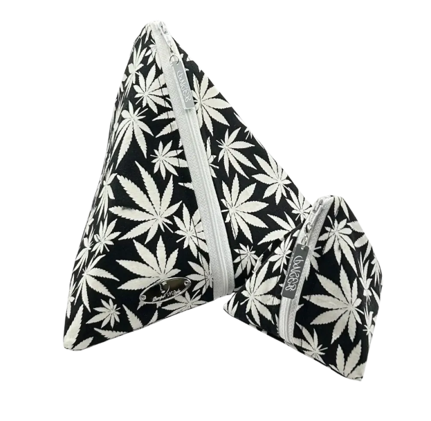 The High Class Duo delivers bold contrast and modern edge. Featuring a sleek black base with striking white cannabis leaf patterns, this set is designed for those who appreciate statement style with everyday practicality. Each pyramid-shaped bag includes a durable zipper and wristlet strap, making them ideal for organizing your essentials with confidence and flair.