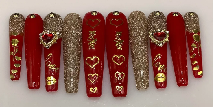 Make a bold and romantic statement with the Love Royale XL Coffin Press-On Nails! This luxurious set features a sultry red and gold design, with elegant metallic heart and rose details, shimmering gold glitter accents, and dazzling jeweled embellishments. The highlight? The stunning spinning heart charms, adding a unique and interactive touch of glamour. Perfect for date nights, special occasions, or whenever you want to radiate love and confidence.