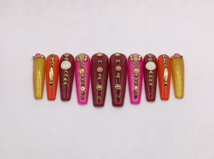 Step into a world of whimsy with the Mad Hatter Press-On Nails! This eccentric and playful set features a stunning blend of rich burgundy, vibrant pink, fiery orange, and shimmering gold, capturing the essence of a fantastical tea party. Embellished with golden accents, gemstone details, and unique clock-face charms, this design exudes a vintage yet extravagant feel—perfect for those who love bold, out-of-the-box fashion. Each set comes with a complete application and removal kit (nail glue & remover, adhesive tabs, cuticle pusher, nail file, buffer, alcohol tabs) making it easy to achieve a salon-quality look at home! Available in S,M,L,and PF (Precision Fit) with our nail sizing service. Choose from pre-designed sets or customize a unique design just for you.