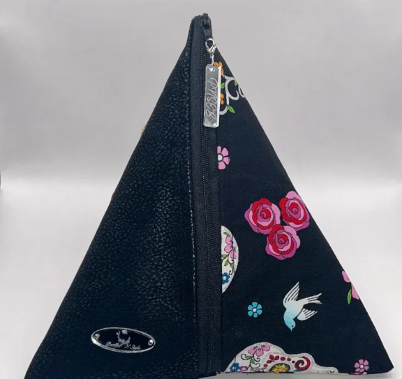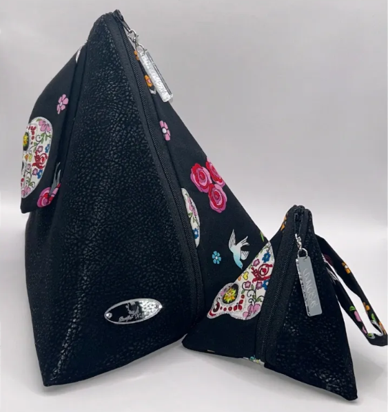 The Midnight Calavera Duo brings a touch of mystery and elegance to your accessory collection. Featuring a striking black base with colorful sugar skulls, roses, and delicate white doves, this duo is both edgy and feminine. Crafted with a mix of sleek black faux leather and vibrant printed fabric, these pyramid-shaped bags are perfect for making a bold style statement.