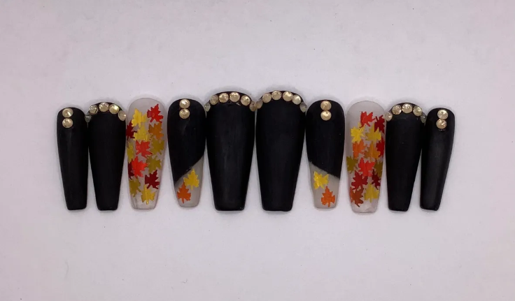 Embrace the beauty of autumn nights with the Midnight Harvest Press-On Nails! This striking set features a luxurious matte black base, elegantly adorned with gold gem accents, paired with crystal-clear nails decorated with vibrant autumn leaves. The contrast between dark sophistication and seasonal warmth makes this set a bold yet cozy statement for fall lovers. Perfect for those who love edgy elegance with a touch of seasonal charm.