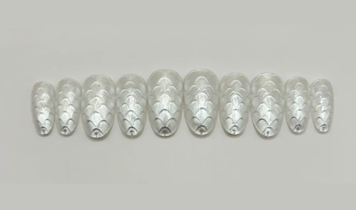 Channel your inner sea goddess with the Pearl Siren Mermaid Press-On Nails, a dazzling set designed for elegance and enchantment. These long oval-shaped nails feature a pearlescent white shimmer with an intricate 3D mermaid scale texture, creating a magical, ethereal look reminiscent of shimmering seashells. Whether for a wedding, special occasion, or everyday luxury, these nails bring effortless sophistication to your style. Available in S,M,L,and PF (Precision Fit) with our nail sizing service. Choose from pre-designed sets or customize a unique design just for you. Each set comes with a complete application and removal kit (nail glue & remover, adhesive tabs, cuticle pusher, nail file, buffer, alcohol tabs) making it easy to achieve a salon-quality look at home!
