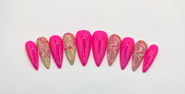 Turn heads with the Pink Lace Elegance long stiletto handmade press-on nails. This striking set features a bold, hot pink base paired with intricate lace-inspired designs in soft gold tones, creating the perfect blend of edgy and sophisticated. Crafted with high-quality gel polish for a salon-quality, long-lasting glossy finish, these nails are designed for those who love a statement look. Available in S,M,L,and PF (Precision Fit) with our nail sizing service. Choose from pre-designed sets or customize a unique design just for you. Each set comes with a complete nail prep and application kit to ensure a flawless application and prevent damage during removal. Easy application, long lasting wear with confidence. Whether for special occasions or everyday glam, Pink Lace Elegance is the perfect choice for a bold yet classy aesthetic.